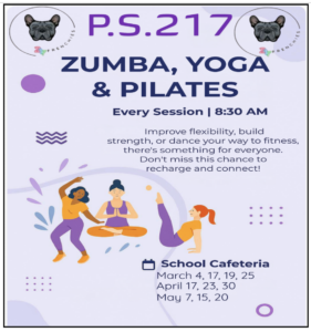 We are so excited to invite you to our upcoming Parent Wellness Workshops! Please join us in the school cafeteria at 8:30 AM for some Zumba, Yoga, and Pilates. It’s a great way to start the day and connect with our school community.